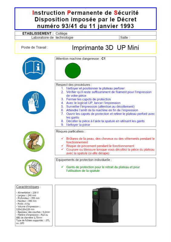 Fiche Sécurité Imprimante3D Up Mini